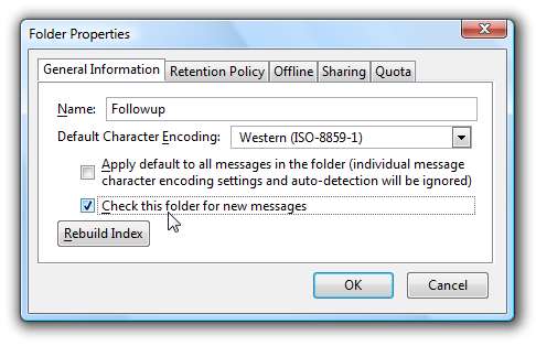 안타깝게도 Thunderbird는 기본적으로받은 편지함 이외의 폴더에서 새 이메일을 확인하지 않으므로 필터와 라벨을 사용하는 경우 폴더 / 라벨 속성으로 이동하여이를 변경할 수 있습니다.