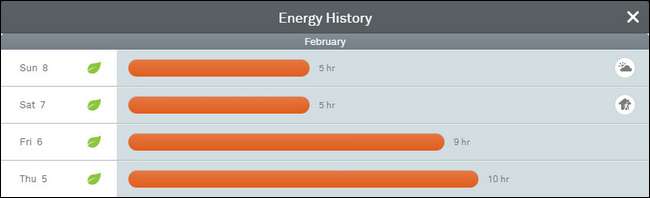 목요일과 금요일에 우리는 하루 종일 집에있었습니다. 토요일에 우리는 하루의 대부분을 떠났습니다 (그러나 Nest는 조정하지 않았습니다). 자동 어웨이 모드로 전환되어 그 과정에서 상당한 양의 에너지를 절약했습니다. 일요일에도 우리는 저축을 즐겼지만 편리한 아이콘으로 두 항목을 구분할 수 있습니다. 작은 집인 토요일 아이콘은 자동 퇴장 기능으로 인해 비용이 절감되었음을 나타냅니다. 그러나 일요일에 우리는 집에 있었고 그날이 비 계절적으로 따뜻했기 때문에 저축이 발생했습니다. 이러한 종류의 간단한 지표를 사용하면 행동 (및 Nest의 도움)의 변화가 실제로 결과를 산출하는시기와 위치를 쉽게 확인할 수 있습니다.