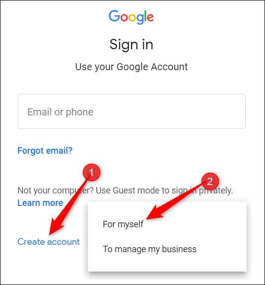 에 머리 accounts.google.com , "계정 만들기"를 클릭 한 다음 "내 자신"을 선택합니다.