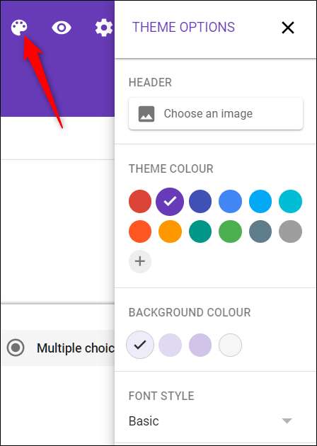화면 상단의 아티스트 팔레트를 클릭합니다. 여기에서 제공된 여러 스톡 사진 중 하나에서 헤더 이미지를 선택하거나 직접 업로드 할 수 있습니다. 양식의 기본 색상, 배경 색상 및 글꼴 스타일을 선택할 수 있습니다.
