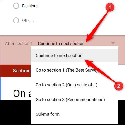 다른 섹션에 질문을 추가하고 싶다면 간단합니다! 섹션간에 끌어서 놓기 만하면됩니다. 섹션 끝에있는 드롭 다운 메뉴를 클릭하여 양식이 다음에 사람들을 안내 할 위치를 선택합니다.