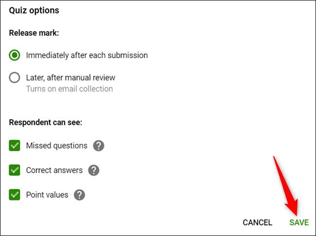 퀴즈 모드를 사용 설정 한 후 학생의 점수를 해제 할시기와 학생이 퀴즈를 제출 한 후 볼 수있는 정보를 선택할 수 있습니다. 완료되면 "저장"을 클릭하여 창을 종료합니다.