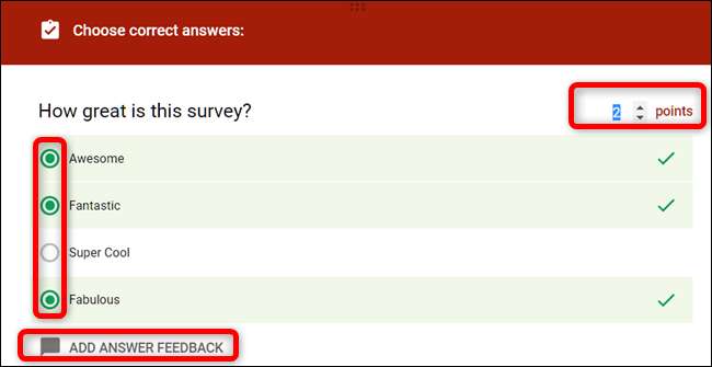 여기에서 정답을 설정하고 각 점수의 가치를 결정하고 각 질문에 대한 답변 피드백을 추가합니다.
