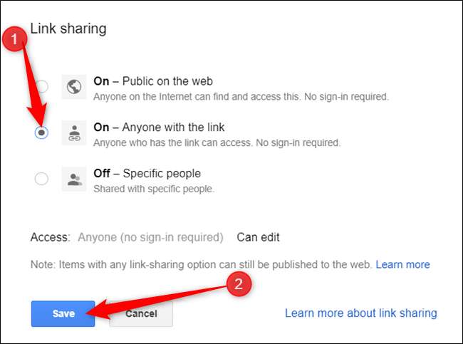 공유 가능한 링크를 생성하려면 "켜기 – 링크가있는 모든 사용자"를 선택합니다. 그러면이 링크가있는 모든 사용자가 양식에 액세스하고 편집 할 수 있습니다. "저장"을 클릭하십시오.