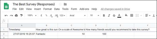 사람들이 양식의 각 질문에 답하면 선택한 Google 스프레드 시트에 응답이 동적으로 표시됩니다.