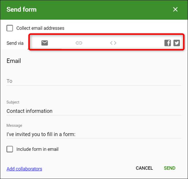 창 상단의 옵션에서 양식 공유 방법을 선택합니다. 왼쪽에서 오른쪽으로 이메일, 직접 링크, 웹 사이트, Facebook 및 Twitter에 대한 포함 된 링크를 선택할 수 있습니다.