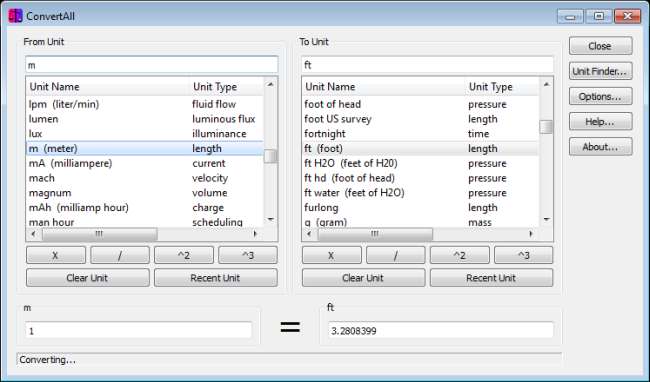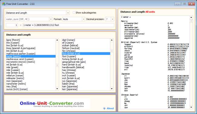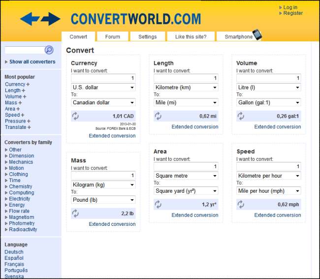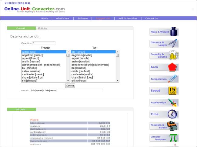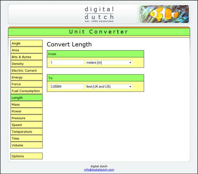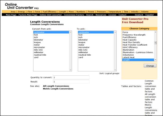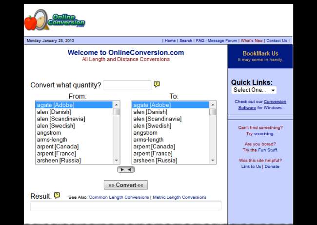 OnlineConversion.com 는 거의 모든 것을 다른 것으로 변환 할 수있는 온라인 도구입니다. 5,000 개 이상의 단위와 50,000 개의 변환이 포함되어 있습니다.