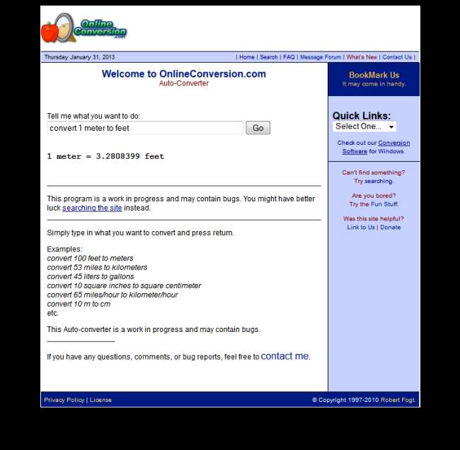 Google은 다양한 단위간에 변환 할 수 있습니다. . "X 단위 대 단위"형식으로 검색어를 입력하면됩니다. 예를 들어 "40도에서 섭씨로"는 화씨 40도를 섭씨로 변환합니다. 당신은 또한 수 Windows 7 계산기를 사용하여 단위 변환 수행 .
