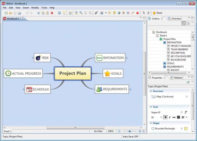 XMind Windows, Linux 및 Mac OS X 용 무료 오픈 소스 마인드 매핑 프로그램으로 아이디어를 계획, 캡처, 구성 및 실행할 수 있습니다. XMind의 Mind Toolbox를 사용하면 주제 간의 관계, 주제 주변의 경계, 선택한 주제의 요약, 주제를 분류하고 주석을 달 수있는 레이블, 우선 순위 또는 진행 상황과 같은 특정 의미를 표현하는 데 사용되는 마커를 설정할 수 있습니다.