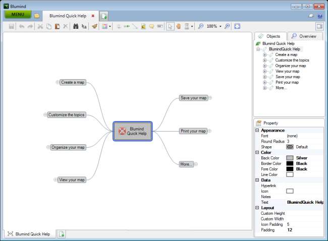 Blumind Windows 용 단순하지만 강력한 무료 마인드 매핑 프로그램으로 조직도, 트리 다이어그램, 논리 다이어그램 등과 같은 여러 차트 레이아웃을 지원합니다. 이 프로그램은 테마를 지원하며 사용자 정의 할 수있는 많은 기본 제공 테마를 포함합니다. 노트, 아이콘, 진행률 표시 줄 및 기타 위젯을 맵에 추가 할 수도 있습니다.
