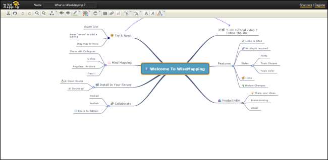 WiseMapping 컴퓨터에 아무것도 설치할 필요가없는 개인과 기업 모두를위한 무료 온라인 마인드 매핑 편집기입니다. 플러그인을 사용하지 않고 웹 페이지에 삽입하여지도를 다른 사람과 쉽게 공유 할 수 있습니다. 또한이 기사의 앞부분에서 언급 한 FreeMind에서지도를 가져오고 내보낼 수 있습니다.