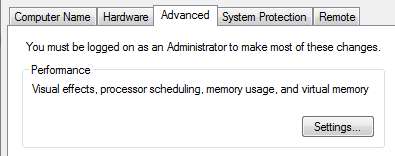 컴퓨터 아이콘을 마우스 오른쪽 버튼으로 클릭하고 고급 시스템 설정 링크를 클릭 한 다음 성능 아래의 설정 버튼을 클릭하여이 설정을 켜고 끌 수 있습니다.