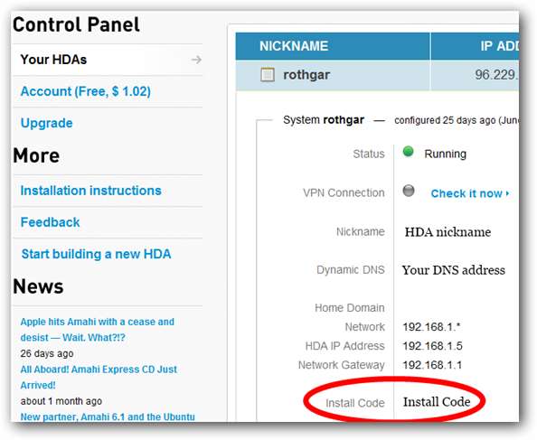 초기 파일 복사 및 드라이브 포맷이 진행되는 동안 다른 컴퓨터에서 amahi.org로 이동하여 사용자 계정으로 로그인하십시오. 로그인하면 제어판으로 이동합니다. 왼쪽의 "Your HDAs"를 클릭 한 다음 생성 된 설치 코드로 스크롤합니다.