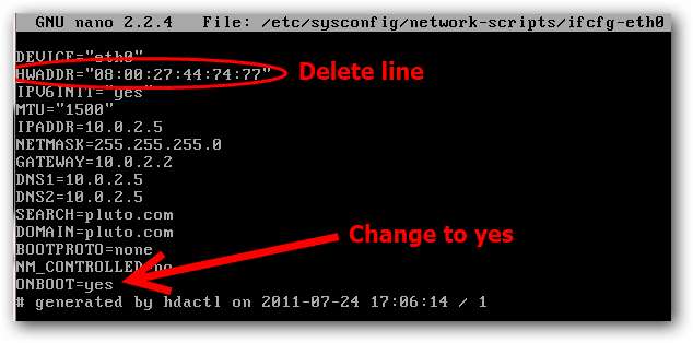 텍스트 편집기에서 HWADDR로 시작하는 줄을 삭제하고 ONBOOT = no를 ONBOOT = yes로 변경합니다.