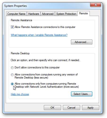 원격 탭을 클릭하고 원격 데스크톱에서 하단 라디오 버튼을 선택합니다. 네트워크 수준 인증을 사용하여 원격 데스크톱을 실행하는 컴퓨터에서만 연결을 허용합니다 (보다 안전함).