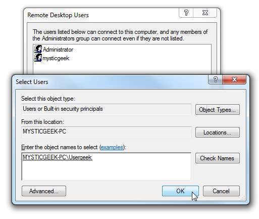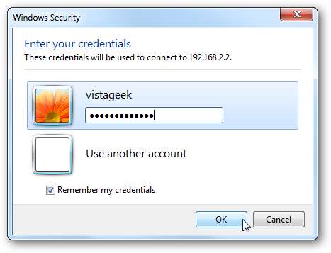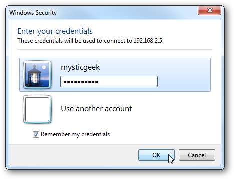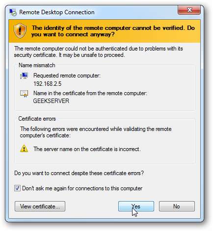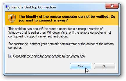 여기에서는 Windows 7 컴퓨터에서 홈 네트워크의 XP 컴퓨터로 원격 이동하고 있으며 다른 보안 메시지가 표시됩니다. 서버로 원격 이동할 때와는 약간 다르지만 다시 연결할 때마다 팝업되지 않도록 선택할 수 있습니다.