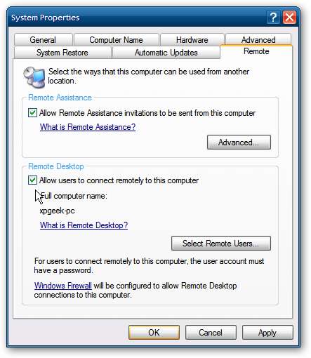 원격 데스크톱에서 XP를 활성화하는 것은 기본적으로 동일합니다. 내 컴퓨터를 마우스 오른쪽 버튼으로 클릭하고 속성을 선택하고 원격 탭을 클릭 한 다음 원격 데스크톱 섹션에서 옆에있는 상자를 클릭합니다. 사용자가이 컴퓨터에 원격으로 연결할 수 있도록 허용 .