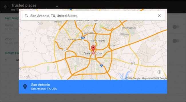 다음 스크린 샷에서지도 아래의 파란색 막대를 탭하기 만하면 샌 안토니오 대도시 전체를 신뢰할 수있는 장소로 선택할 수 있습니다. 분명히 아이디어는 특정 비즈니스 또는 주소와 같이 기기의 전체 보안을 손상시키지 않는 더 작은 영역을 추가하는 것입니다.
