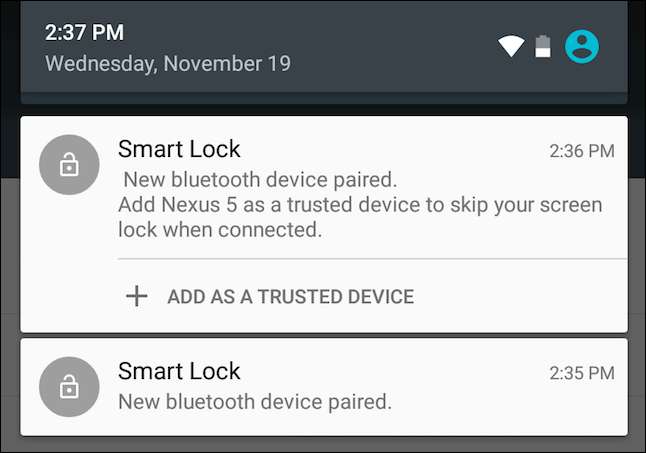 블루투스 기기와 페어링하면 Smart Lock 신뢰할 수있는 기기로 추가 할 수 있다는 알림이 표시됩니다.