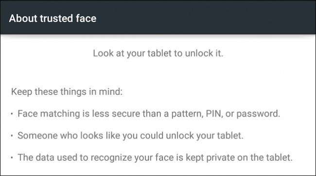 얼굴을 신뢰할 수있는 얼굴로 추가하려면 Smart Lock 설정에서 '신뢰할 수있는 얼굴'버튼을 탭하세요. 초기 화면에서 얼굴 잠금 해제는 다른 잠금 해제 방법만큼 안전하지 않으며, 당신처럼 보이는 사람이 내 기기를 잠금 해제 할 수 있다는 것을 알려줍니다.