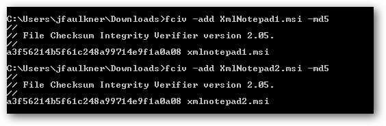 다음 두 파일을 고려하십시오. 두 파일은 모두 Microsoft의 XML 메모장 2007 용으로 다운로드 한 설치 파일의 복사본입니다. 각 파일의 이름은 다르지만 (숫자 1과 2는 끝에 추가됨) 확인 된대로 완전히 동일하다는 것을 알 수 있습니다. MD5 해시로.