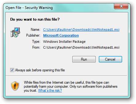 예를 들어, 인터넷에서 다운로드 한 상태를 XmlNotepad1.msi 파일에 다시 추가하려는 경우 절차는 간단합니다.