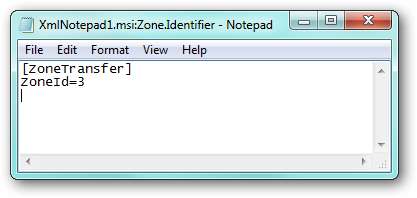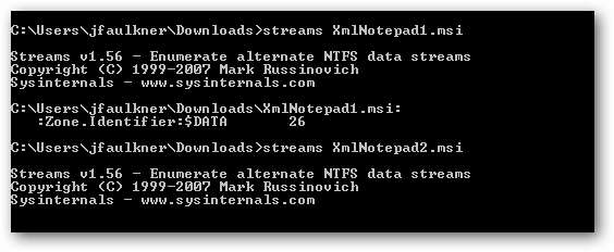 Sysinternals Streams 유틸리티 (C : \ Windows 디렉터리에 복사)를 사용하면 XmlNotepad1.msi에 26 바이트의 데이터가 포함 된 단일 ADS가 포함되어 있고 XmlNotepad2.msi에는 ADS가 없음을 알 수 있습니다. 기본적으로 Windows는 "Zone.Identifier"라는 ADS 내부의 데이터를 기반으로 인터넷에서 가져온 파일을 알고 있습니다.