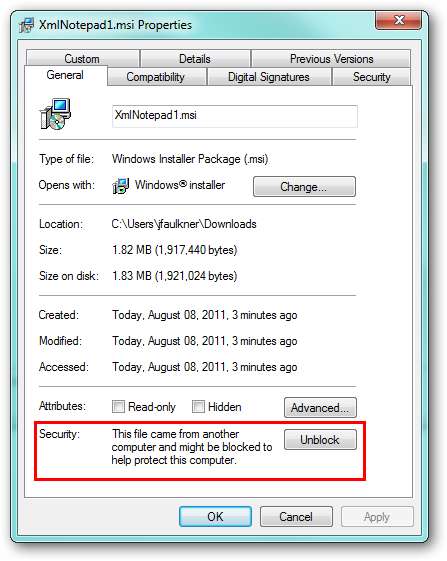 이제 XmlNotepad1.msi를 실행하거나 해당 속성을 볼 때마다 이전 경고가 표시됩니다.