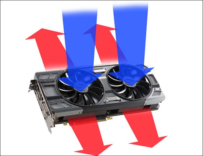 개방형 GPU 쿨러는 팬에서 공기를 받아 방열판 위로 뜨거운 공기를 퍼뜨린 다음 그래픽 카드의 상단과 하단에있는 구멍을 통해 케이스 내부로 따뜻한 공기를 다시 배출합니다. 그렇기 때문에 GPU의 그래픽 프로세서에 연결된 방열판과 케이스 내부의 공기 사이에 아무것도 없기 때문에 "오픈 에어"라고합니다. 공기 흐름은 다음과 같이 팬에 의해 그래픽 카드로 유입 된 차가운 공기를 나타내는 파란색 화살표와 방열판을지나 PC 내부로 다시 배출되는 뜨거운 공기를 나타내는 빨간색 화살표가 있습니다.