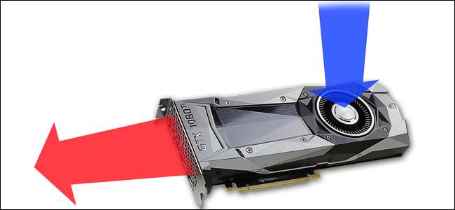 GPU의 경우 그래픽 카드의 팬이 과도한 열을 제거하는 방법에 차이가 있습니다. 두 종류 모두 외부 플라스틱 케이스에 장착 된 냉각 장치에 하나 이상의 팬을 사용하고 카드 자체에서 전원을 끌어옵니다. 이 팬은 PC 케이스 내부에서 뜨거운 공기를 흡수합니다. 최소한 즉시는 아니지만 공기를 배출하지 않습니다.