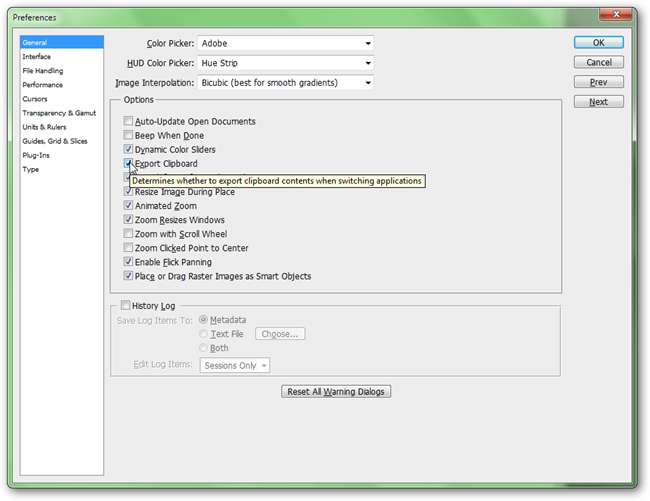 De oplossing : Druk op sneltoets Ctrl + K om uw voorkeuren en onder Algemeen , vindt u "Export Clipboard". Hierdoor kunt u geen afbeeldingsgegevens kopiëren en plakken van Photoshop, maar niet in Photoshop.