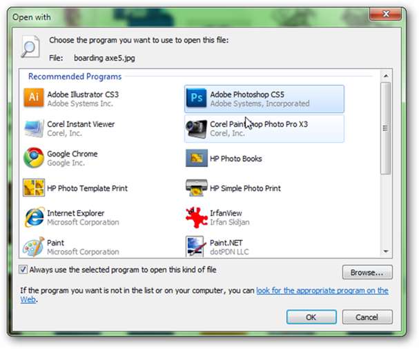 Van daaruit kunt u het bestand (en het daaropvolgende bestandstype) aan Photoshop koppelen en Windows instrueren om altijd dat programma voor dat type bestand te gebruiken.