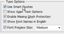 De oplossing : Weinig bekend feit, "Straight Quotes" zijn eigenlijk helemaal geen aanhalingstekens, maar een notatie van feet en inches. De meeste programma's corrigeren 'Slimme aanhalingstekens' automatisch in plaats daarvan, maar dit kan veel problemen veroorzaken. De eenvoudigste manier is om het gebruik van slimme aanhalingstekens te omzeilen, door ze uit te schakelen. Gebruik de sneltoets Ctrl + K om Voorkeuren te openen en naar 'Type' te gaan. U vindt daar een optie om de autocorrectie van Smart Quote uit te schakelen.