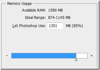 De oplossing: Het voor de hand liggende antwoord is om uw machine te upgraden, in het bijzonder naar RAM toevoegen . Een nieuwe pc of componenten zijn echter niet altijd een optie voor pc-gebruikers. Navigeer dus eenvoudig naar uw voorkeuren met de sneltoets Ctrl + K. Onder "Prestaties" vindt u een submenu waarmee u Photoshop meer bronnen kunt geven, tot 100% van het beschikbare RAM. Hoe meer hoe beter, maar let op het "ideale bereik", tenzij u niet van plan bent om naast Photoshop andere programma's uit te voeren.