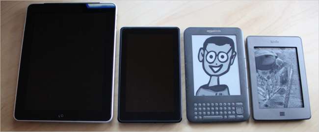 Van links naar rechts: iPad, Kindle Fire, Kindle (3) -toetsenbord, Kindle Touch