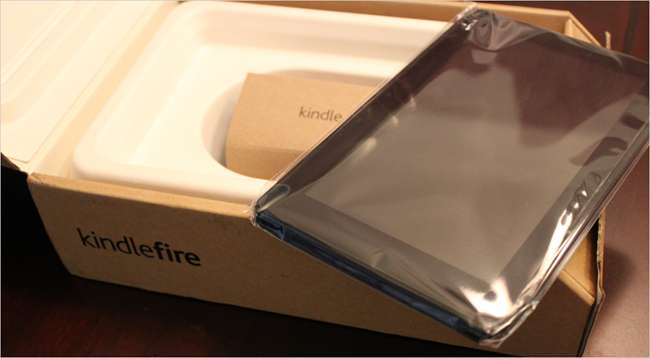De Fire is eenvoudig verpakt, met niets meer dan een netsnoer en het apparaat. U hoeft geen gebruikershandleiding te lezen en u hoeft deze niet op uw computer aan te sluiten. Het enige dat u echt hoeft te doen, is het apparaat aanzetten, en dat is waar u een zeer aangename startup-ervaring zult vinden. Als je je Kindle Fire hebt gekocht via je Amazon-account (in tegenstelling tot een cadeau van iemand anders), is de installatie bijna direct: maak gewoon verbinding met je wifi-netwerk en je bent klaar. Als uw tablet een cadeau was, moet u inloggen, maar dat is letterlijk alles.