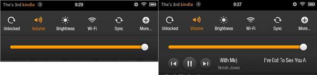U kunt ook het instellingenmenu gebruiken om het apparaat te dwingen te synchroniseren of de schermoriëntatie te vergrendelen. Als je muziek afspeelt, zie je het nummer dat momenteel wordt afgespeeld en de muziekbediening, wat redelijk handig is, ervan uitgaande dat je een van de standaard Kindle-apps gebruikt waarmee je snel naar de instellingen kunt gaan.