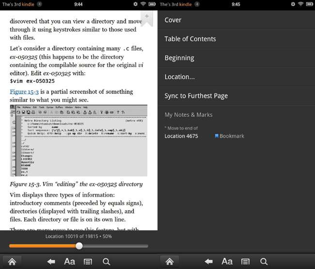 Het navigatiemenu is een gebied waar de Fire beslist een grote verbetering is ten opzichte van de e-ink Kindles - je kunt gemakkelijk overal in het boek komen, inclusief al je bladwijzers en notities, die daar op het scherm verschijnen. Uitermate handig voor non-fictieboeken die je misschien hebt gemarkeerd met een heleboel notities. Dat brengt ons bij een goed punt: het vuur is een stuk beter voor non-fictie in het algemeen, aangezien je misschien snel naar een sectie wilt bladeren of ze regelmatig opnieuw wilt openen.