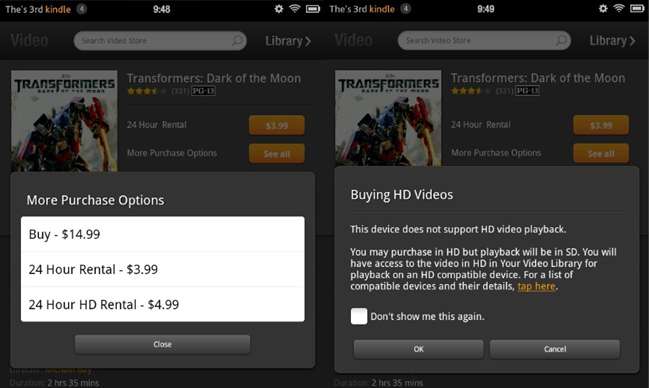The Fire kan geen echte HD-video afspelen, althans niet volgens de specificaties van Amazon. Wat interessant is, is dat als je klikt om compatibele apparaten te zien, de Fire daar wordt vermeld. De standaardvideo ziet er echter geweldig uit op het scherm en wordt gepresenteerd in breedbeeldformaat. Als je iets in HD huurt, kun je on the Fire in standard def kijken, of in plaats daarvan op je computer of tv in high def.