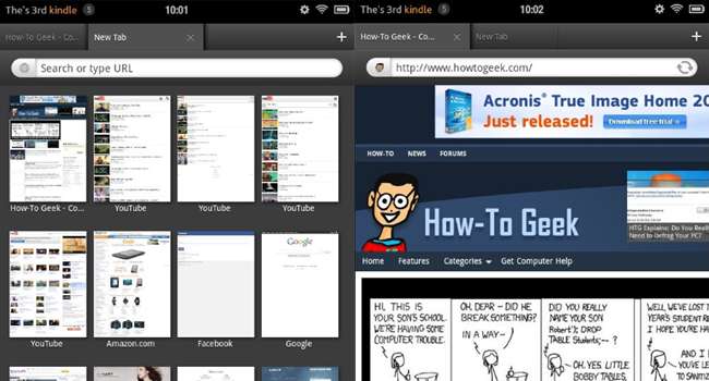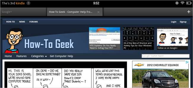 Bij de tests die we de afgelopen twee dagen hebben gedaan sinds we onze Fire hebben gekregen, is de browse-ervaring niet zo snel als je zou hopen. Amazon beweert dat dit komt omdat hun caching-algoritme nog moet worden klaargemaakt, maar we testen dit hier op een 35/35 Mb FIOS-netwerk, dus het zou er niet toe doen. Bladeren door pagina's is een beetje zenuwachtig, en het scherm lijkt voor veel sites precies de verkeerde grootte te hebben, zoals de onze, die duidelijk het mobiele thema voor Kindle-lezers zal moeten gebruiken. Browsen met tabbladen voelt gewoon als verspilling van schermruimte, vooral in de liggende modus.