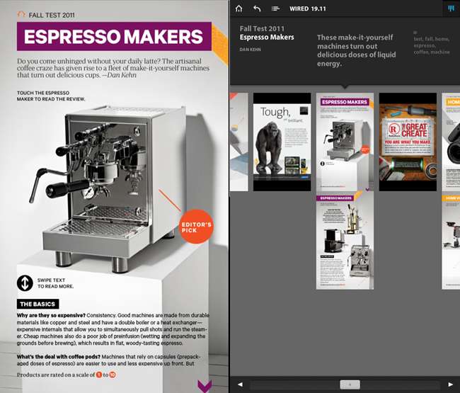 Dan zijn er tijdschriften als Wired en GQ, die niet worden afgeleverd met het Amazon-inhoudssysteem. In plaats daarvan worden ze geïmplementeerd als apps en moet u zich afzonderlijk abonneren en inloggen. Ze zijn een beetje meer gedoe, maar het eindresultaat is een heel mooi tijdschrift dat is ontworpen voor de Kindle. Deze tijdschriften zijn prachtig, en echt een bewijs van wat een tabletmagazine kan zijn. U kunt op sommige pagina's omhoog en omlaag vegen om het hele artikel te lezen, of naar links en rechts om tussen artikelen te navigeren. Er is ook een manier om achteruit te zoomen en alle pagina's van het tijdschrift te zien in een weergave waarin u gemakkelijker het hele tijdschrift kunt scannen. Het is indrukwekkend.