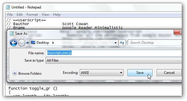 Als u uw eigen gebruikersscripts wilt schrijven of scripts wilt installeren waarvoor u de code heeft, kunt u deze als volgt in Chrome installeren. Plak de code gewoon in een teksteditor zoals Kladblok en sla deze op met de bestandsextensie .user.js .