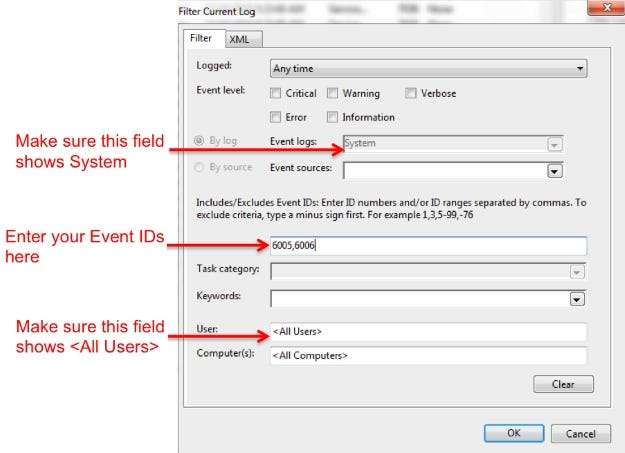 - Als je wilt, kun je ook gebeurtenis-ID 6013 aan je filter toevoegen. Dit toont de uptime van het systeem na het opstarten.
