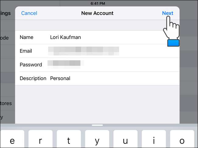 Voer in het dialoogvenster "Nieuw account" uw "Naam", "E-mail", "Wachtwoord" en "Beschrijving" in voor het e-mailaccount dat u wilt toevoegen. Tik vervolgens op "Volgende".