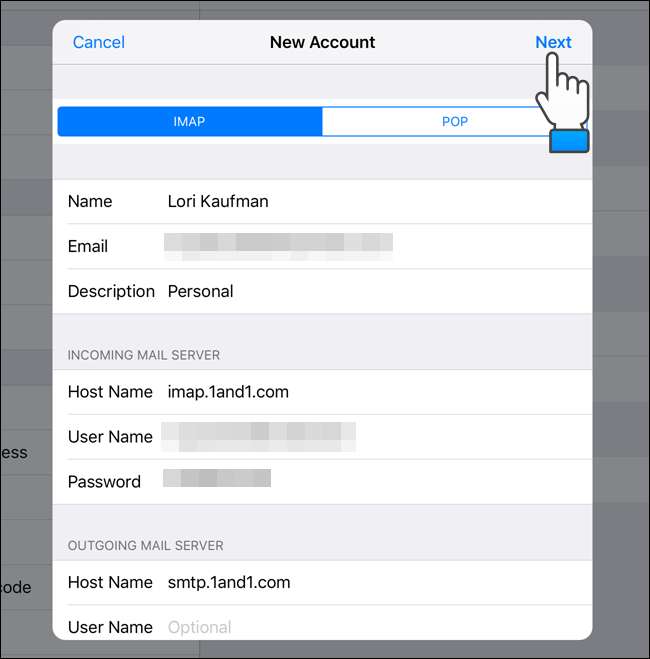 In het volgende scherm kunt u selecteren of u uw e-mailaccount wilt instellen met IMAP of POP. Wij raad aan om IMAP te gebruiken , wat de standaardselectie is. Voer in het gedeelte "Inkomende mailserver" de "Hostnaam", "Gebruikersnaam" en "Wachtwoord" in. Voer vervolgens dezelfde informatie in voor de "Server voor uitgaande e-mail". Merk op dat de "Gebruikersnaam" en "Wachtwoord" optioneel zijn voor de "Uitgaande mailserver". Neem contact op met het bedrijf dat uw domein en e-mailaccounts host voor de hostnamen voor de inkomende en uitgaande mailservers. Tik op "Volgende" als u klaar bent met het invoeren van de accountgegevens.