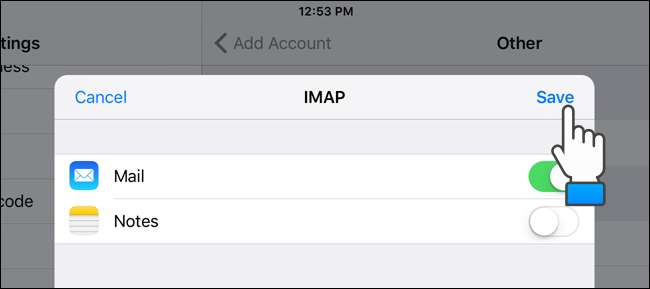 Selecteer in het "IMAP" -dialoogvenster wat u wilt synchroniseren op uw iOS-apparaat en tik vervolgens op "Opslaan".