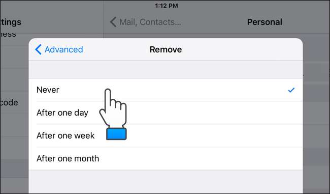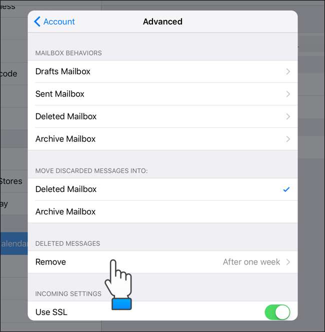 Wanneer u een e-mailbericht verwijdert van een IMAP-account in de Mail-app op een iOS-apparaat, wordt het bericht standaard één week verwijderd van de server nadat het bericht van het apparaat is verwijderd. Dit geeft u de kans om het bericht te downloaden in andere e-mailclients die u op andere apparaten gebruikt. U kunt dit tijdsbestek echter aanpassen door op "Verwijderen" te tikken in het dialoogvenster "Geavanceerd".
