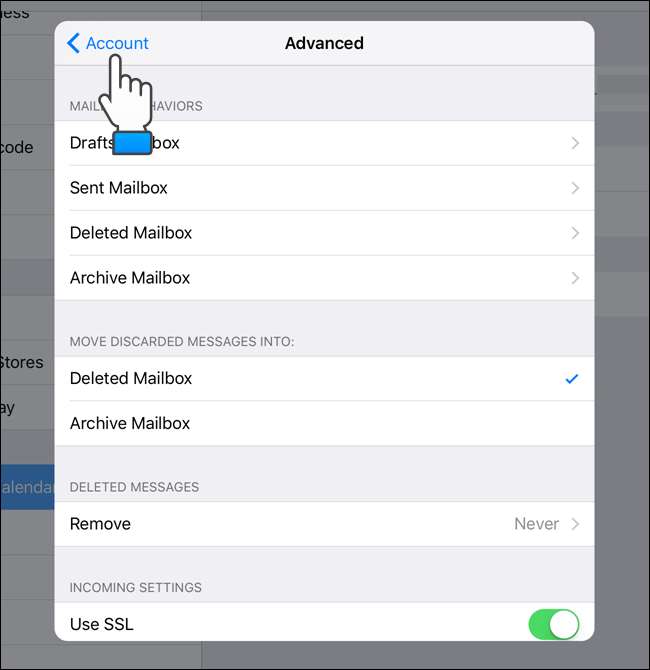 Uw nieuwe selectie voor de optie "Verwijderen" wordt rechts van "Verwijderen" weergegeven. Om het dialoogvenster "Geavanceerd" te sluiten, tikt u op "Account" in de linkerbovenhoek van het dialoogvenster.