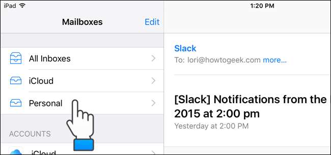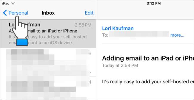 Net als uw andere e-mailaccounts worden de berichten aan de linkerkant van het e-mailvenster weergegeven. De lijst met berichten blokkeert mogelijk een deel van het huidige bericht dat wordt weergegeven, afhankelijk van of uw apparaat in staande of liggende modus staat. Tik op de naam van het e-mailaccount in de linkerbovenhoek om terug te keren naar de lijst met "Mailboxen".