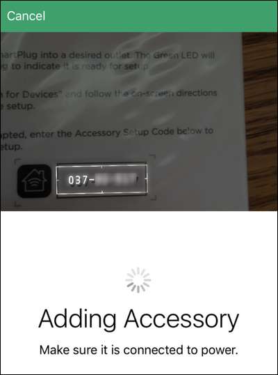 Nadat u verbinding heeft gemaakt met het wifi-netwerk, wordt u gevraagd de HomeKit-accessoirecode voor het apparaat te scannen. De accessoirecode bevindt zich zowel op de stekker als op de kaft van de producthandleiding (zie hieronder).